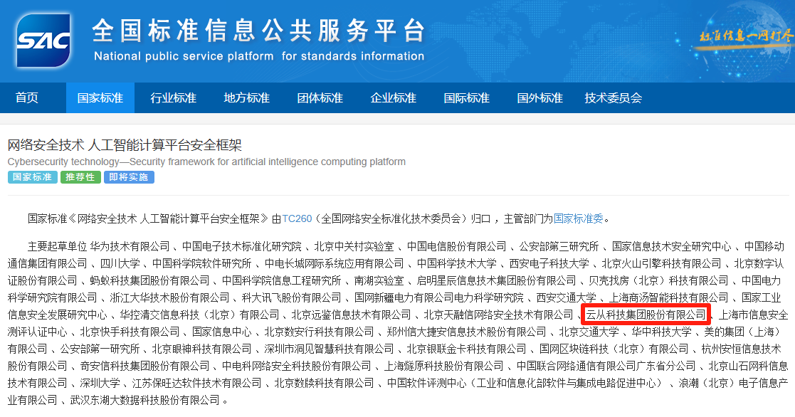 近日,國家標準GB/T 45958-2025《網(wǎng)絡安全技術 人工智能計算平臺安全框架》正式發(fā)布。該標準由全國網(wǎng)絡安全標準化技術委員會歸口管理,華為技術有限公司牽頭,云從科技作為核心起草單位之一,深度參與了標準制定工作。 這項將于2026年2月1日正式實施的國家標準,為人工智能計算平臺建立了系統(tǒng)化的安全框架,規(guī)定了安全功能、安全管理和角色安全職責,將有效應對硬件漏洞、訓練數(shù)據(jù)泄露、對抗樣本攻擊等新型安全威脅。